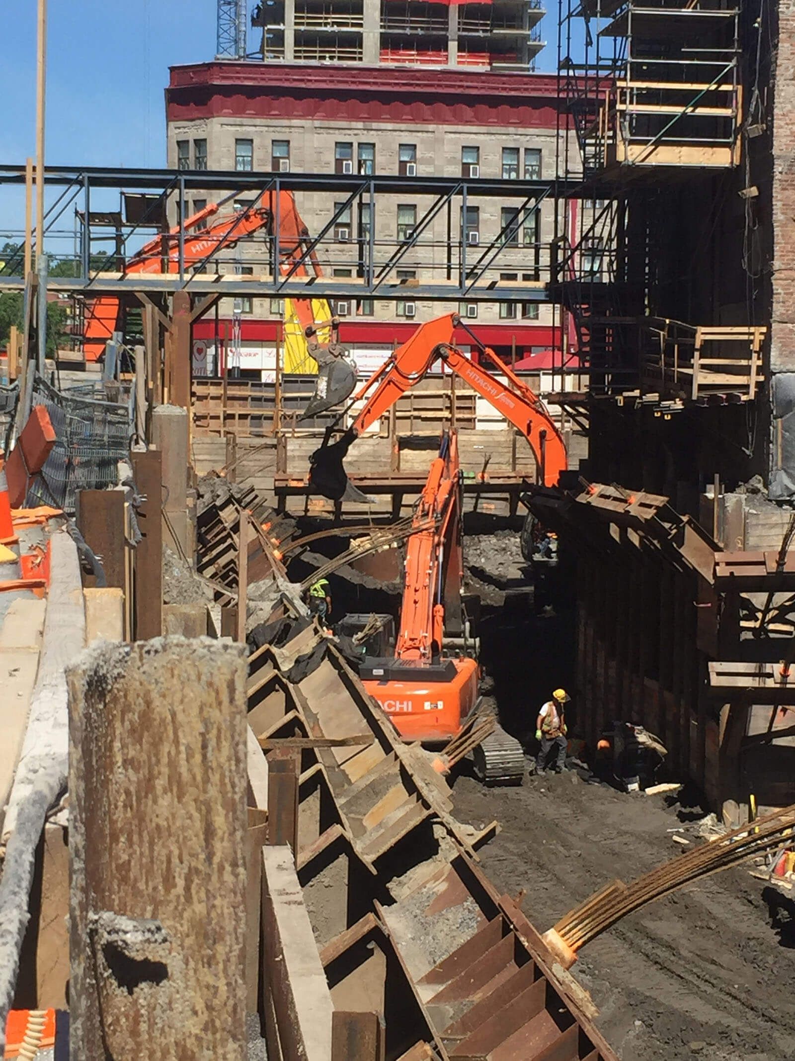 Deep excavation in the block bounded by Saint-Laurent Boulevard and Clark and Sainte-Catherine streets. The project girded existing buildings that were preserved and remained operational throughout the work. Underpinning and retention were completed under high surveillance. The Carré Saint-Laurent project was governed by LEED certification.