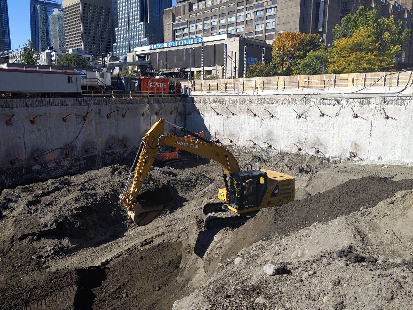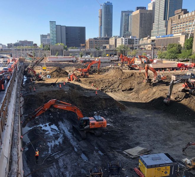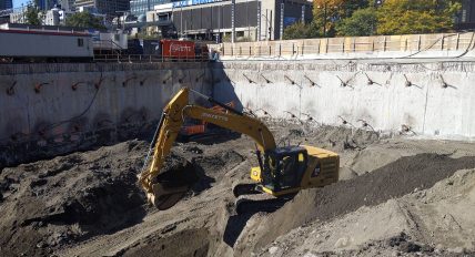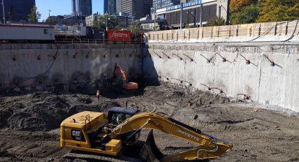 Travaux d’excavation pour la construction du nouveau siège social de la Banque Nationale, au 800, rue Saint-Jacques, à Montréal. Le mandat d’excavation profonde a été réalisé en même temps que l’excavation du projet Victoria sur le parc, au 700, rue Saint-Jacques.
